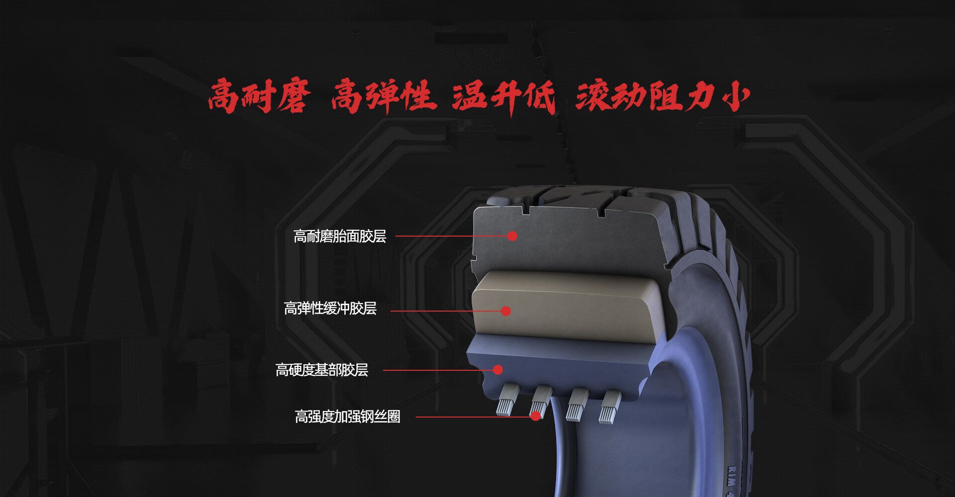 實心輪胎主要適用于地面復雜惡劣工況下的叉車、拖車、裝載機、軍用車輛等機械車輛的配備,廣泛應用 于鋼鐵廠、礦山、建筑工程、港口、物流、廢金屬加工廠等領域。 實心輪胎胎體為全橡膠構成,最大限度地保證了輪胎的耐刺穿性,從根本上消除了工業車輛在承載運行過 程中及在惡劣的作業環境中的輪胎刺穿隱患。實心輪胎的負荷—形變量小、運行穩定性好,因其耐刺耐撕、耐 高溫、耐腐蝕、耐磨損,無需充氣,避免了頻繁補胎換胎的繁重勞動,可提高車輛的使用率和工作效率,在低 速、高效運行車輛